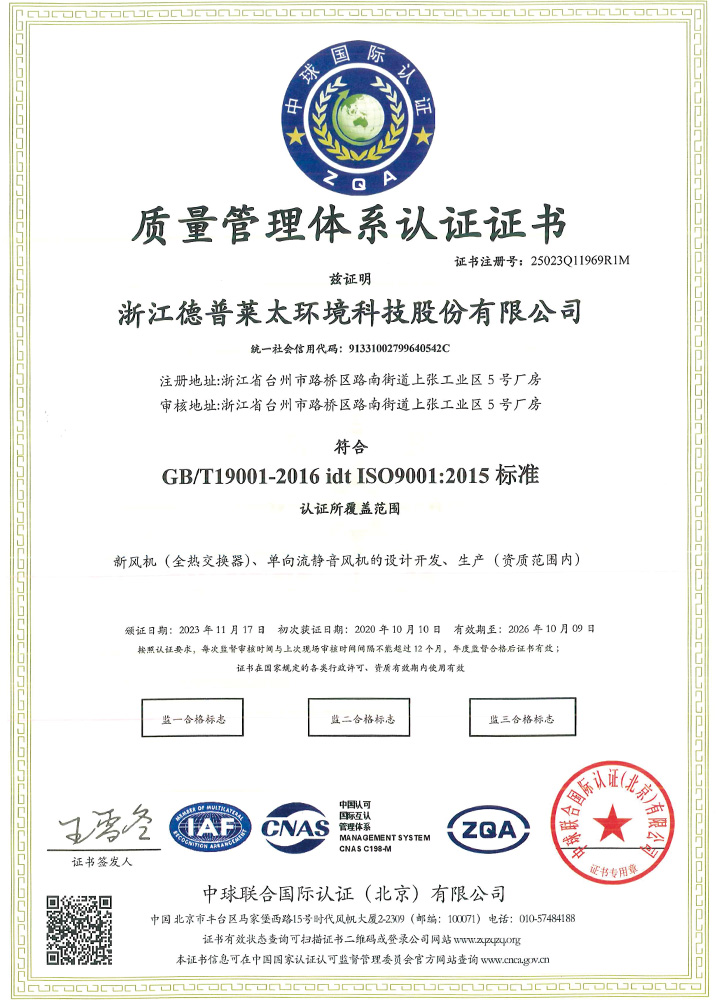 公司秉承“誠信、擔當、創新、共贏”的企業精神,產品制造精益求精,通過了ISO9001質量管理體系、ISO14001環境管理體系、ISO45001職業健康安全管理體系等認證。主導起草了T∕NAIC 001-2021《超低能耗建筑新風系統技術規程》、RISN-TG043-2022《居住建筑新風系統應用技術導則》等標準,參編了JGJ∕440-2018《住宅新風系統技術標準》、GB∕T 21087-2020《熱回收新風機組》、GB∕T 40438-2021《熱泵型新風環境控制一體機》、GB∕T 40379-2021《戶用和類似用途組合式空氣處理機組》等多項標準,擁有發明專利6項。公司是中國建筑金屬結構協會凈化與新風委員會副主任單位、被動式低能耗建筑產業技術創新戰略聯盟副理事長單位,被授予高新技術企業、浙江省專精特新中小企業、浙江省科技型中小企業、臺州市專精特新小巨人企業和國家級綠色(設計)產品、浙江制造精品、浙江制造認證證書等多項榮譽。